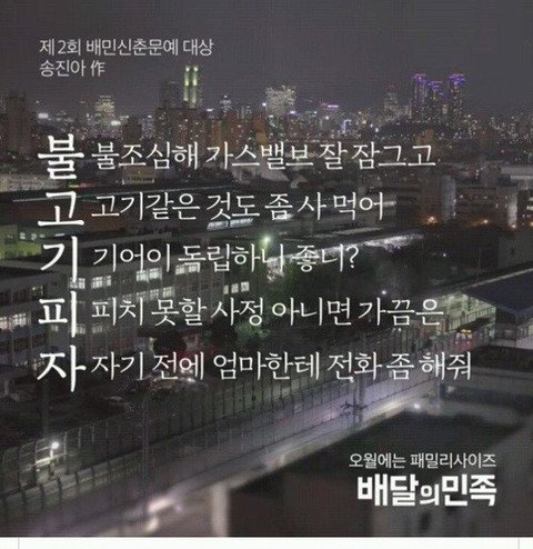 배달의 민족 `불고기피자`5행시로 대상 받은 글 페이지 정보 작성자 김서서코 댓글 0건 조회 2,740회 작성일 24-07-22 17:30 목록 답변 글쓰기 게시판 리스트 옵션 수정 삭제 본문 배달의 민족 `불고기피자`5행시로 대상 받은 글 쿠팡 파트너스 활동의 일환으로, 이에 따른 일정액의 수수료를 제공받습니다. 이전글내가 로또번호 알아옴 24.07.22 다음글서울대생의 일침 24.07.22 댓글 0 댓글목록 등록된 댓글이 없습니다.