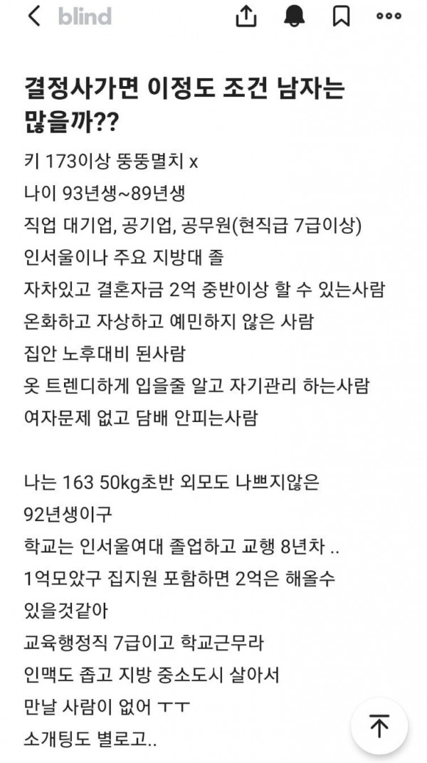 92년생 블라인드 여자가 원하는 남자라는데 > 유머/감동