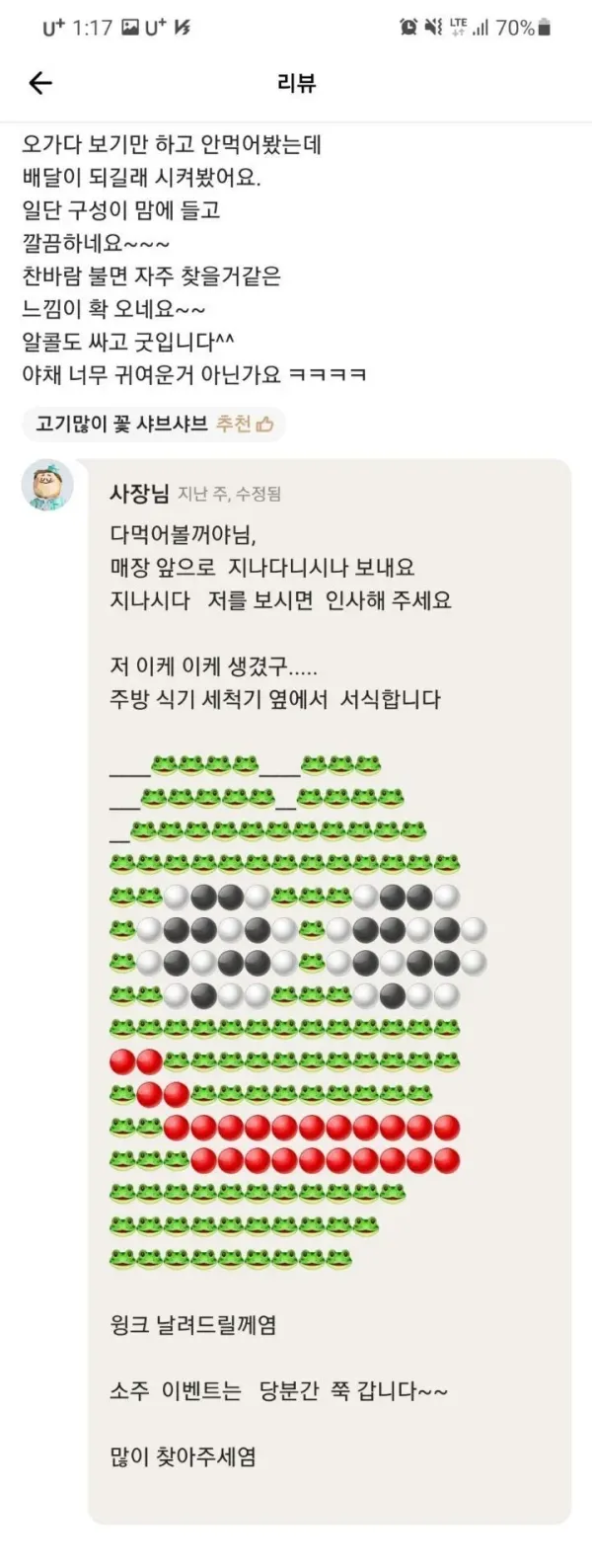 어느 배민 사장님의 리뷰 답글 페이지 정보 작성자 난나냐 댓글 0건 조회 1,388회 작성일 25-09-28 07:15 목록 답변 글쓰기 게시판 리스트 옵션 수정 삭제 본문 어느 배민 사장님의 리뷰 답글.jpg1 쿠팡 파트너스 활동의 일환으로, 이에 따른 일정액의 수수료를 제공받습니다. 이전글영국의 베이커리 맛집 25.09.28 다음글군기 씨게 잡힌 타코야키 사장님 25.09.28 댓글 0 댓글목록 등록된 댓글이 없습니다.