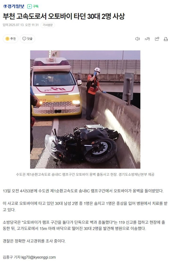 부천 고속도로서 오토바이 타던 30대 2명 사상10