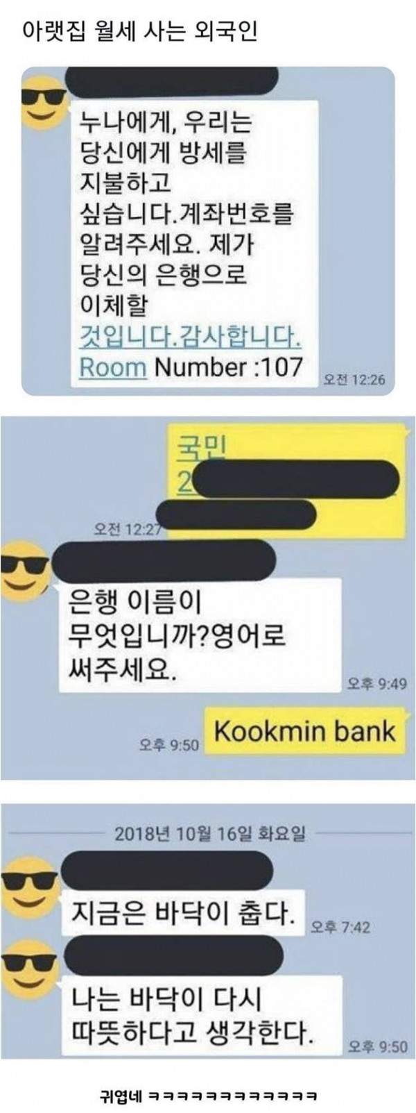 아랫집 월세사는 외국인이 보낸 문자 페이지 정보 작성자 김민준둔 댓글 0건 조회 3,597회 작성일 24-04-02 10:35 목록 답변 글쓰기 게시판 리스트 옵션 수정 삭제 본문 . 쿠팡 파트너스 활동의 일환으로, 이에 따른 일정액의 수수료를 제공받습니다. 이전글임영웅 팬 어머님을 둔 초등학생 아들 24.04.02 다음글75만원 환불 불가 대게집 24.04.02 댓글 0 댓글목록 등록된 댓글이 없습니다.