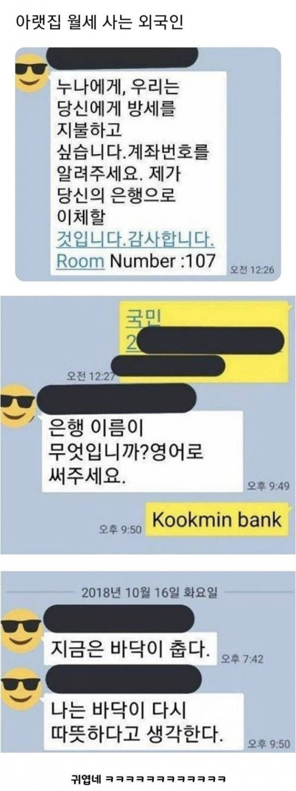 아랫집 월세사는 외국인이 보낸 문자 페이지 정보 작성자 clever 댓글 0건 조회 3,560회 작성일 24-04-03 17:39 목록 답변 글쓰기 게시판 리스트 옵션 수정 삭제 본문 . 쿠팡 파트너스 활동의 일환으로, 이에 따른 일정액의 수수료를 제공받습니다. 이전글카드를 분실했는데 300원이 긁혔네요 24.04.03 다음글새마을 금고 폭탄 테러 협박범의 정체 24.04.03 댓글 0 댓글목록 등록된 댓글이 없습니다.