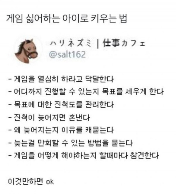 게임 싫어허는 아이로 키우는 법 페이지 정보 작성자 꿈망울 작성일 24-04-15 10:02 조회 3,217 댓글 0 본문 이전글 백종원이 말하는 최소한의 양심 다음글 요즘 고객센터 전화 화나는점 댓글목록 0 등록된 댓글이 없습니다.