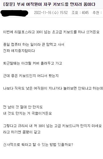 여직원이 키보드를 만지고 싶어해요 페이지 정보 작성자 닉넴어렵네에 댓글 0건 조회 3,441회 작성일 24-04-15 11:01 목록 답변 글쓰기 게시판 리스트 옵션 수정 삭제 본문 쿠팡 파트너스 활동의 일환으로, 이에 따른 일정액의 수수료를 제공받습니다. 이전글하루에 민원 20건씩 넣던 인간의 정체 24.04.15 다음글현재 의사들이 복귀 하고 싶어도 못하는 이유 24.04.15 댓글 0 댓글목록 등록된 댓글이 없습니다.