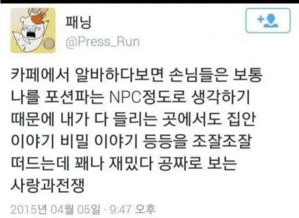 카페 알바가 의외로 재밌는 이유 페이지 정보 작성자 jumpman23 작성일 24-04-17 17:58 조회 3,461 댓글 0 본문 이전글 남자가 여성 전용 주차구역에 주차하는 법 다음글 정관수술한 남편에게 선물을 준 아내 ..JPG 댓글목록 0 등록된 댓글이 없습니다.