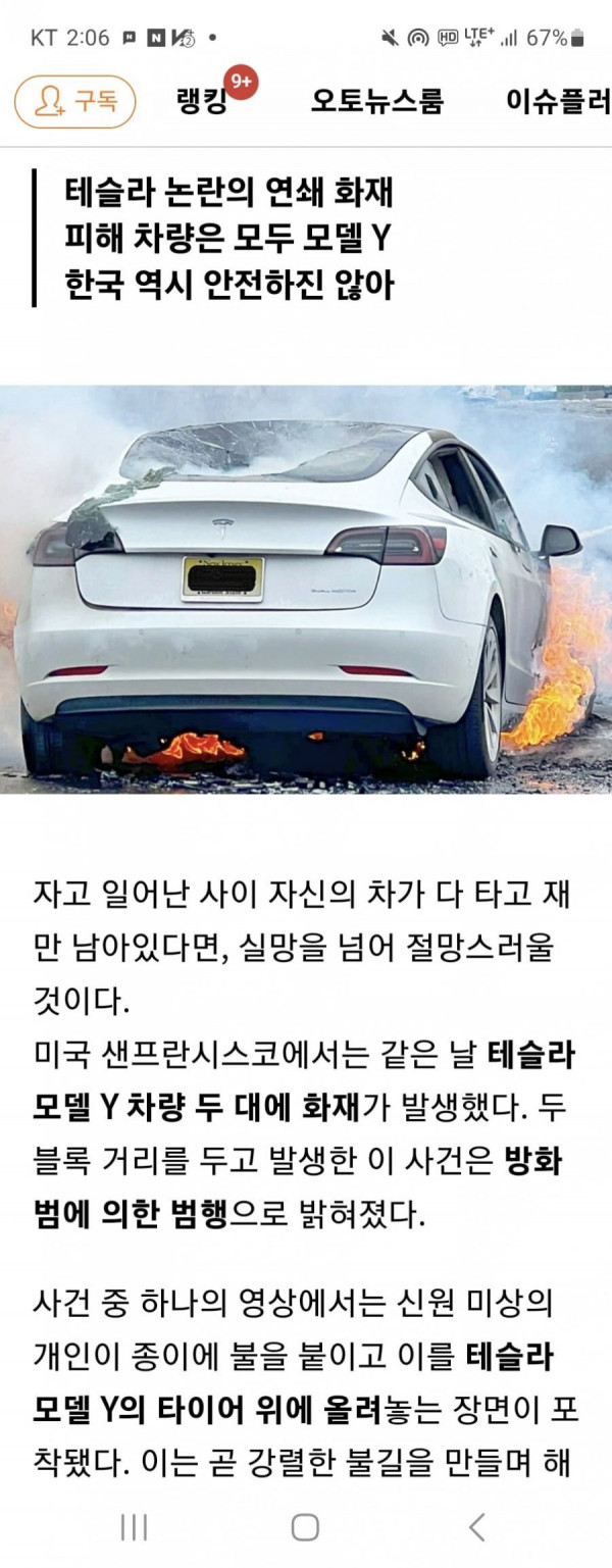 https://newautopost.co.kr/msn/article/68770/ 내용 - 누가 방화로 모델y 만 불지름... 근데 기사 제목은 ...