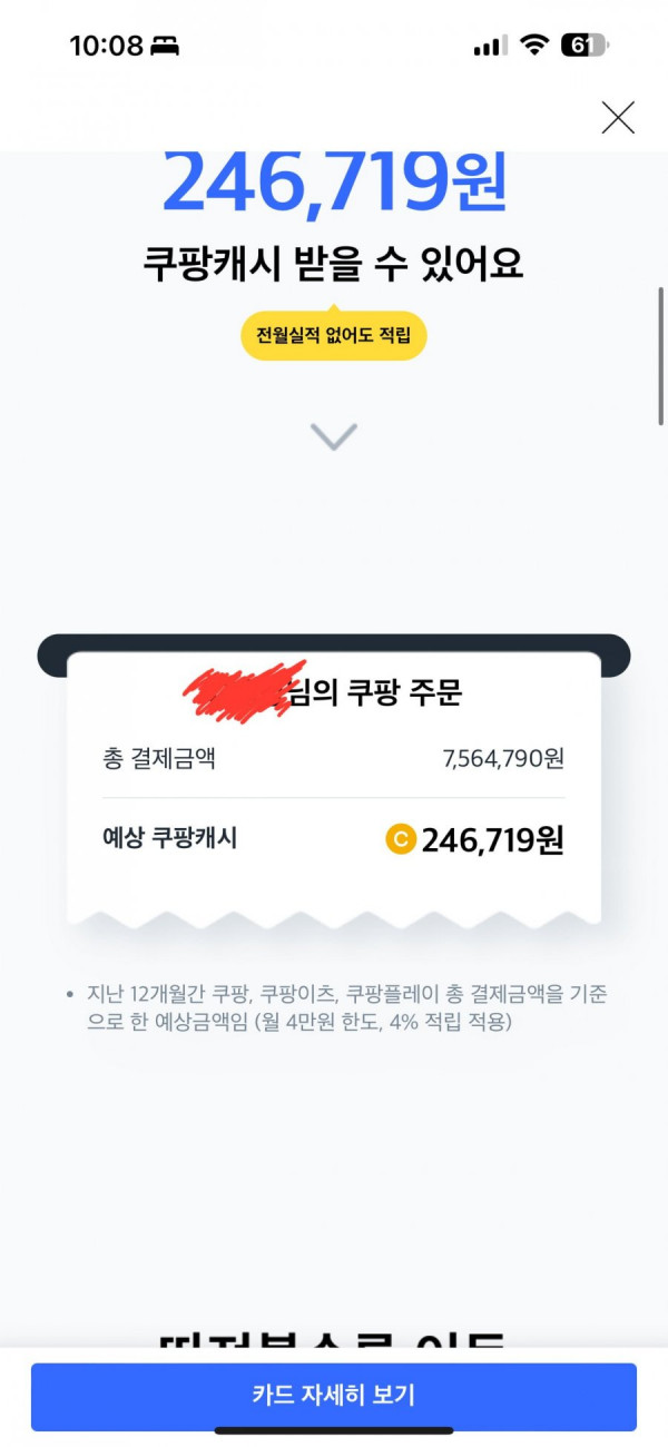 1년 기준인데.. 다들 얼마 쓰셨는지 봐보세요내정보->쿠팡캐시키프티카드제휴포인트->카드그림 아래 혜택바로보기