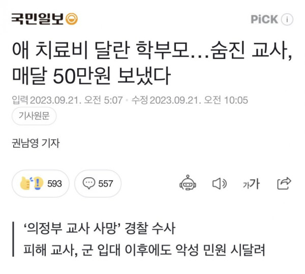 의정부 사망 교사, 입대 이후까지 치료비 보상 요구 이어져서 월급날마다 50만원씩 지급4