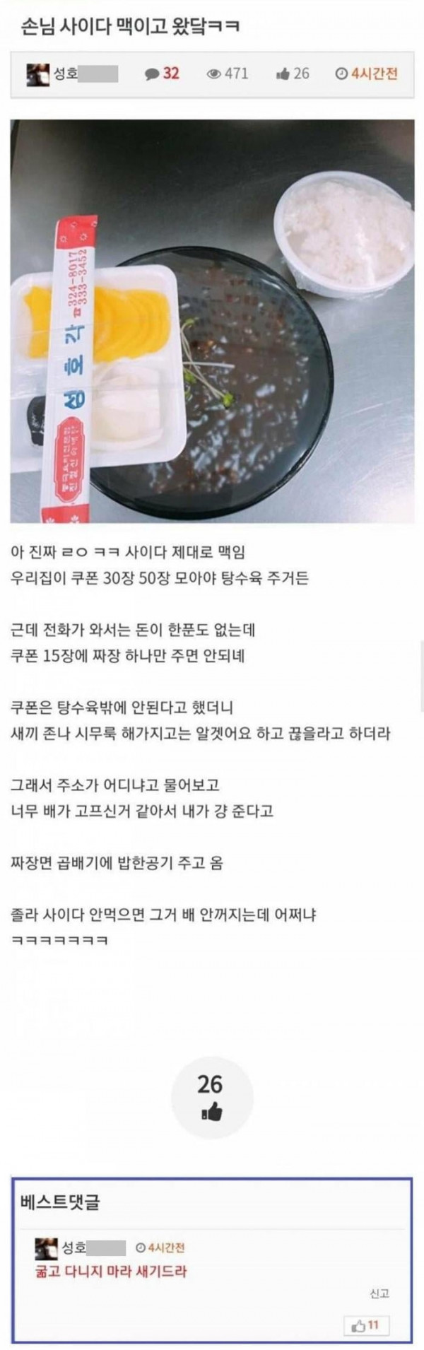 어느 중국집 사장님 인성 페이지 정보 작성자 DROPSHIP 작성일 24-04-11 17:52 조회 3,303 댓글 0 본문 훈훈하네요 ^^ 이전글 오늘도 평화로운 당근 다음글 아직도 믿기지 않는 장면 ㄷ. 댓글목록 0 등록된 댓글이 없습니다.