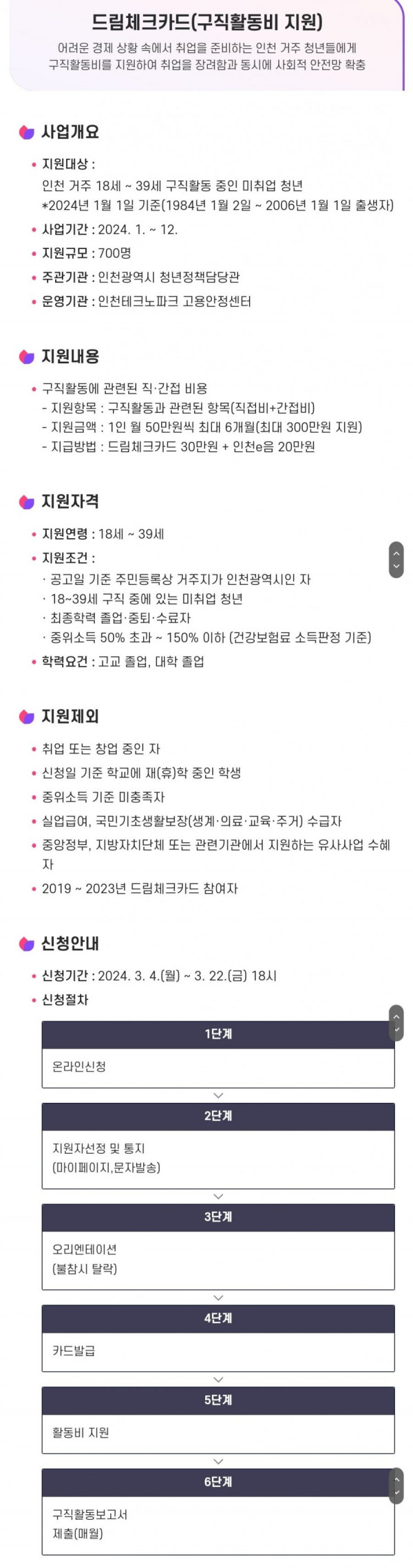 인천시 드림체크카드(구직 청년 최대 300만원) ~3/22 6시까지